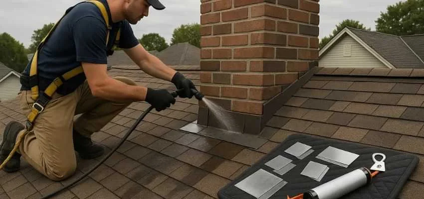 We examine crown slope, cap fit, mortar joints, brick or stone surfaces, and flashing transitions at the roofline. In Anderson Farms, Lancaster this area is often the origin of leaks.
